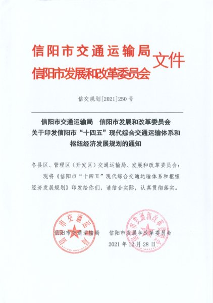 信交规划[2021]250号 信阳市交通运输局 信阳市发展和改革委员会关于印发信阳市“十四五”现代综合交通运输体系和枢纽经济发展规划的通知