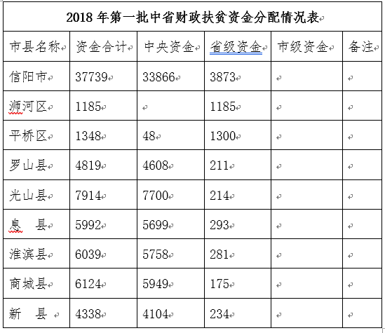 根据《河南省扶贫资金项目公告公示制度》(豫扶贫办〔2017〕129号)有关规定,现将2018年我市第一批中省扶贫资金分配下达情况公示如下: