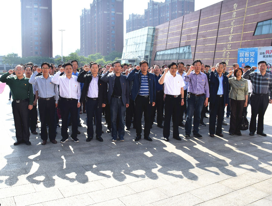 全体党员干部首先在纪念馆门前佩戴党徽,对着党旗,重温入党誓词,进行庄严宣誓。