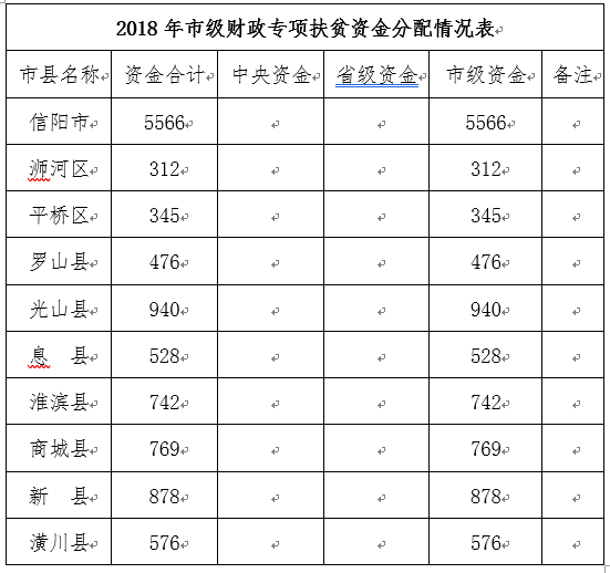 根据《河南省扶贫资金项目公告公示制度》(豫扶贫办〔2017〕129号)有关规定,现将2018年我市第一批中省扶贫资金分配下达情况公示如下: