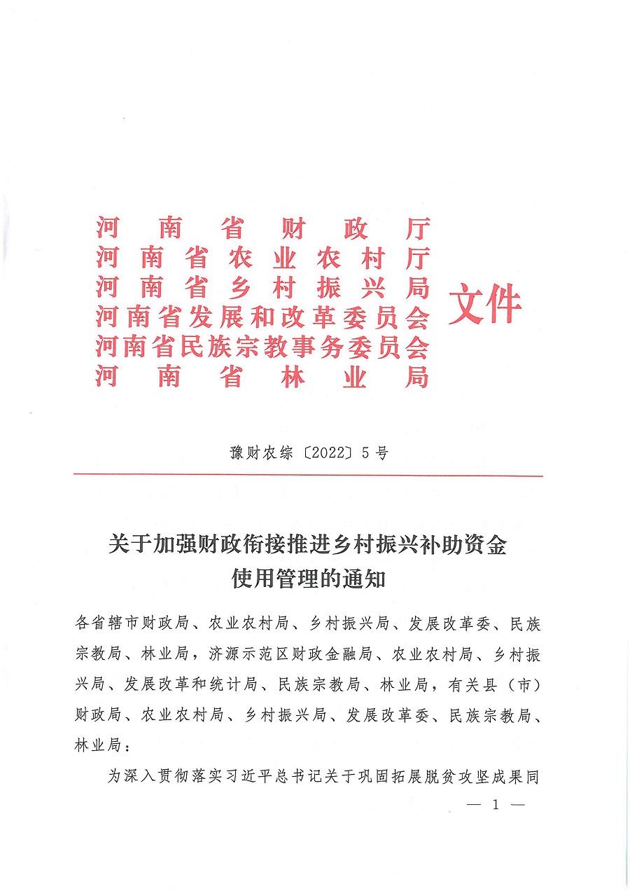 豫财农综〔2022〕5号 关于加强衔接推进乡村振兴补助资金使用管理的通知
