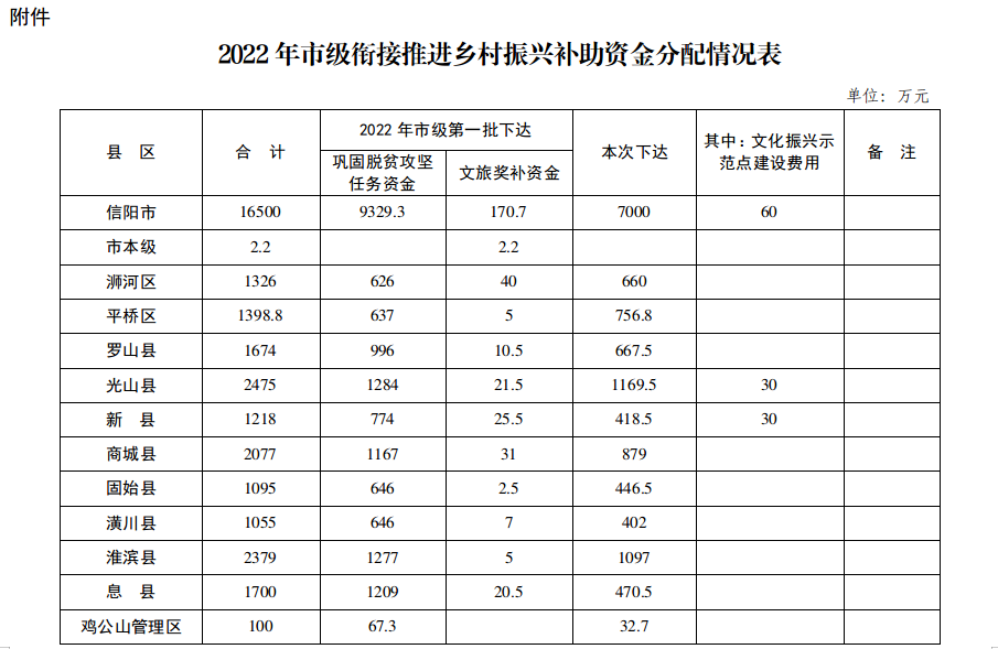 为认真贯彻落实党中央国务院、省委省政府和市委市政府关于做好脱贫攻坚与实施乡村振兴战略有效衔接的有关精神,持续巩固脱贫攻坚成果,根据《信阳市财政衔接推进乡村振兴补助资金管理办法》(信财农综〔2021〕5号)规定,按照年初预算安排,现下达2022年第二批市级财政衔接推进乡村振兴补助资金(巩固脱贫攻坚成果和乡村振兴任务) 7000万元(详见附件),并将有关事项通知如下: