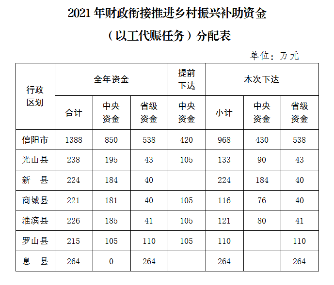 为贯彻落实省委省政府、市委市政府关于巩固拓展脱贫攻坚成果同乡村振兴有效衔接的精神,根据河南省财政厅 河南省发展和改革委员会《关于下达2021年财政衔接推进乡村振兴补助资金(以工代赈任务)的通知》(豫财农综〔2021〕11号)及《河南省财政衔接推进乡村振兴补助资金管理办法》(豫财农综〔2021〕9号),现下达2021年财政衔接推进乡村振兴补助资金(以工代赈任务)(资金规模详见附件),并将有关事项通知如下: