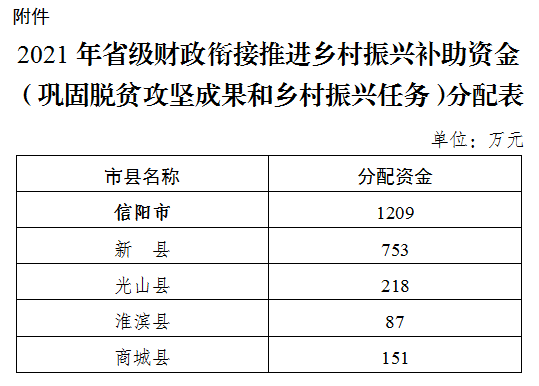 为深入贯彻习近平总书记防止因灾返贫重要指示和省委、省政府防止因灾返贫致贫、巩固拓展脱贫攻坚成果要求,根据河南省财政厅 河南省乡村振兴局《关于下达2021年省级财政衔接推进乡村振兴补助资金(巩固脱贫攻坚成果和乡村振兴任务)的通知》(豫财农综〔2021〕26号)和《信阳市财政衔接推进乡村振兴补助资金管理办法》(信财农综〔2021〕5号,以下简称《管理办法》),现下达2021年省级财政衔接推进乡村振兴补助资金(巩固脱贫攻坚成果和乡村振兴任务)(资金规模详见附件),并将有关事项通知如下: