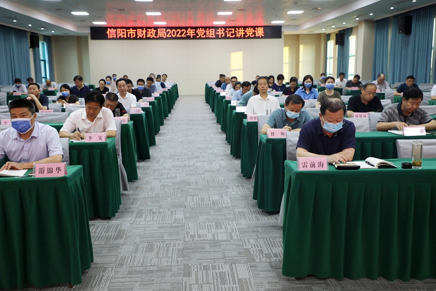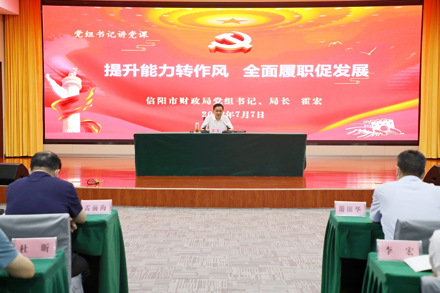 7月7日,信阳市财政局党组书记、局长霍宏以“提升能力转作风 全面履职促发展”为主题讲党课。在家领导班子成员、机关各科室及局属单位负责人聆听授课。
