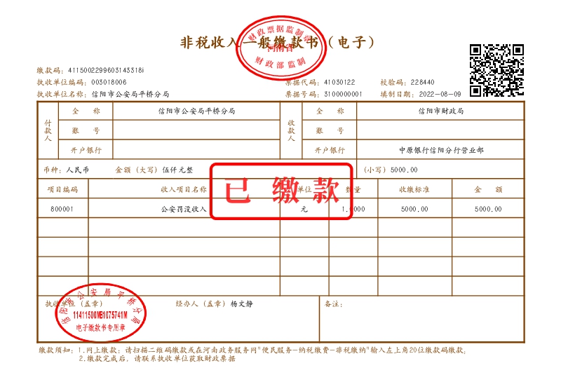 8月9日,信阳市第一张电子非税收入缴款通知书在市公安局平桥分局顺利开出,并通过中原银行信阳分行营业部成功完成缴款,标志着我市电子非税收入一般缴款书改革工作圆满完成。