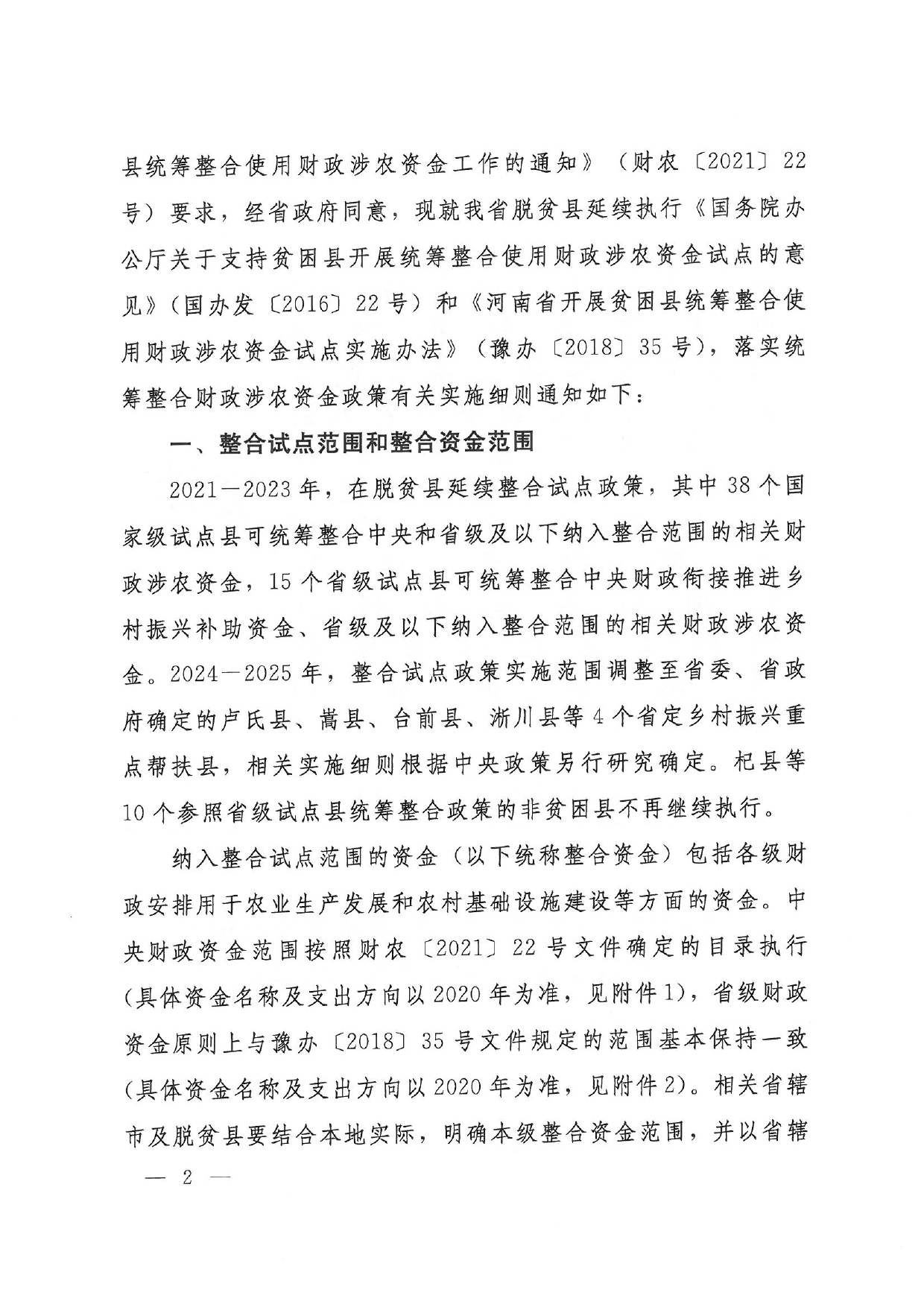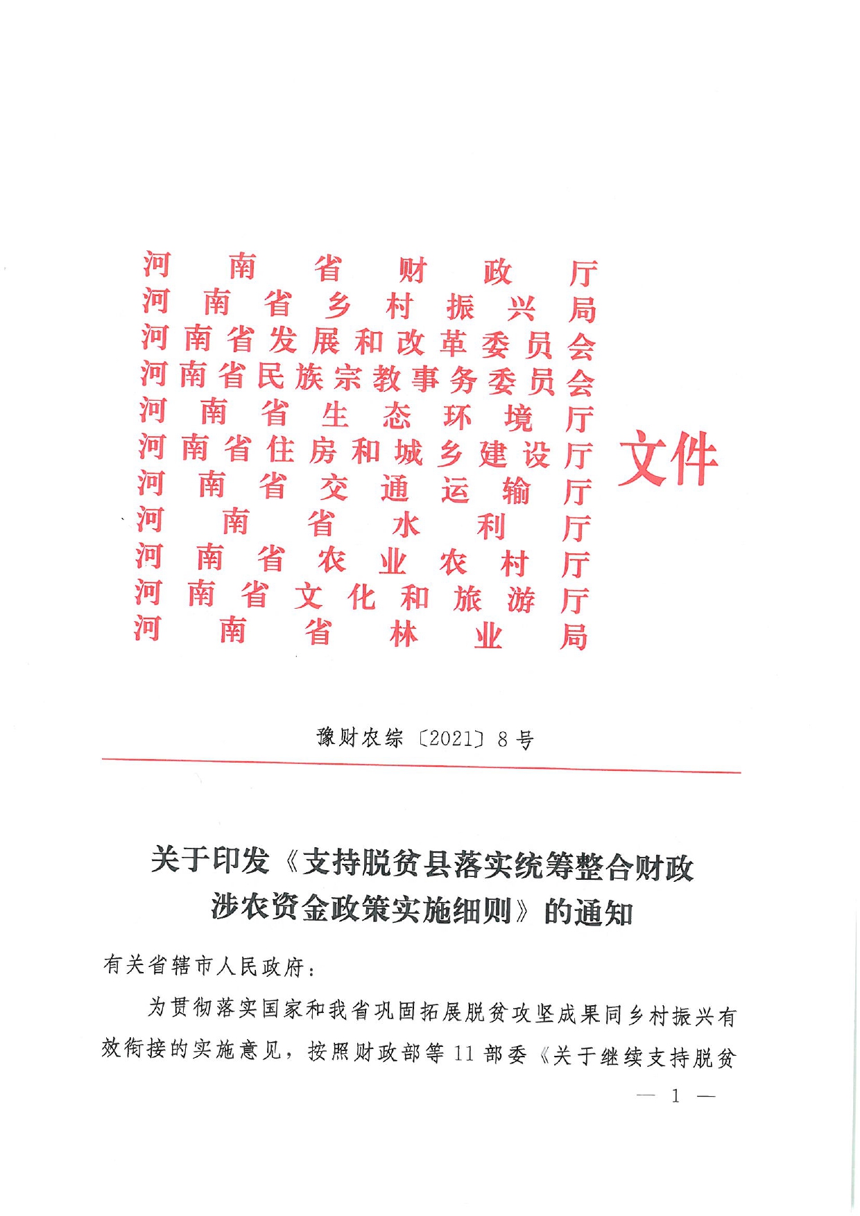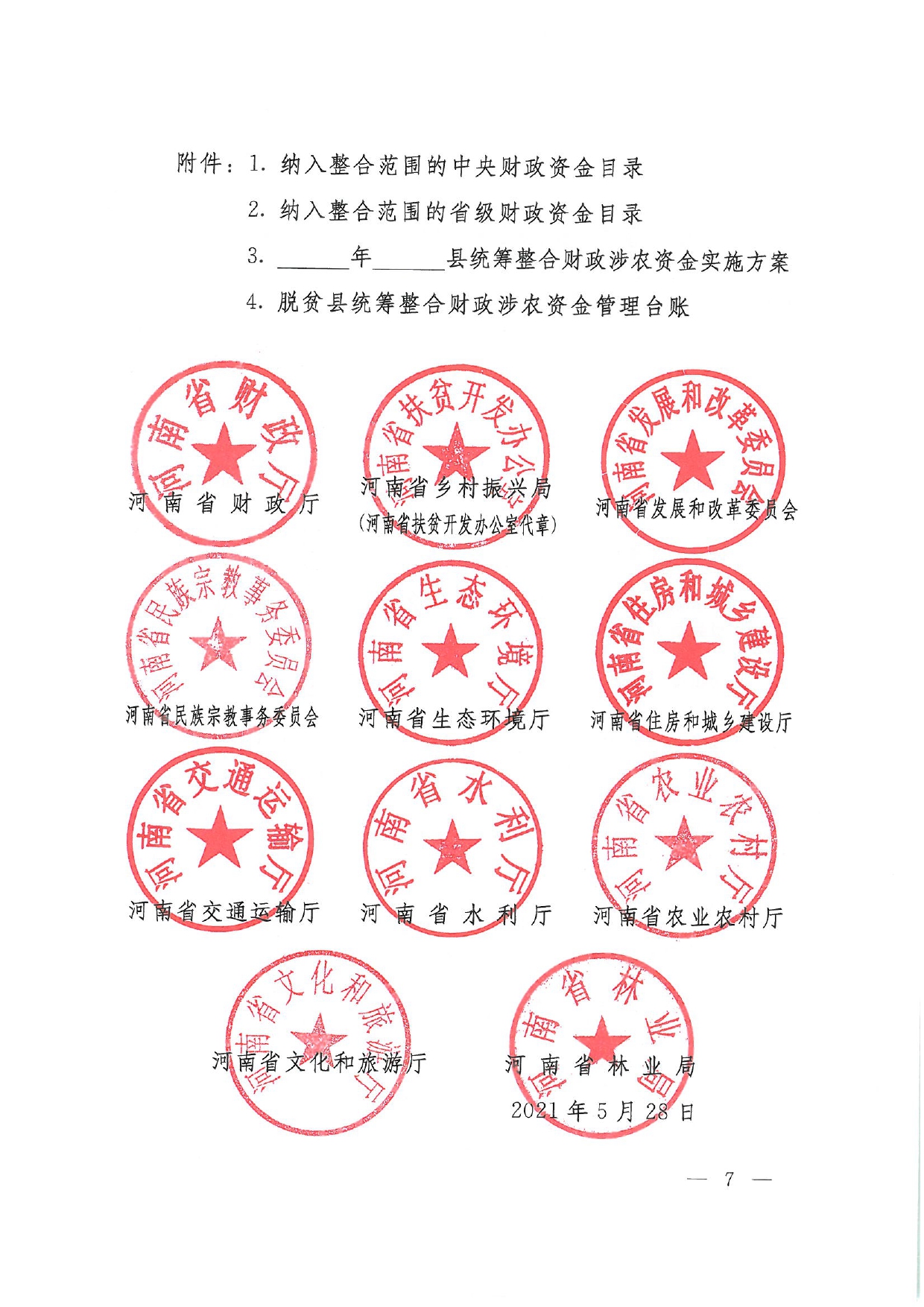 河南省财政厅等11部门关于印发《支持脱贫县落实统筹整合财政涉农资金政策实施细则》的通知