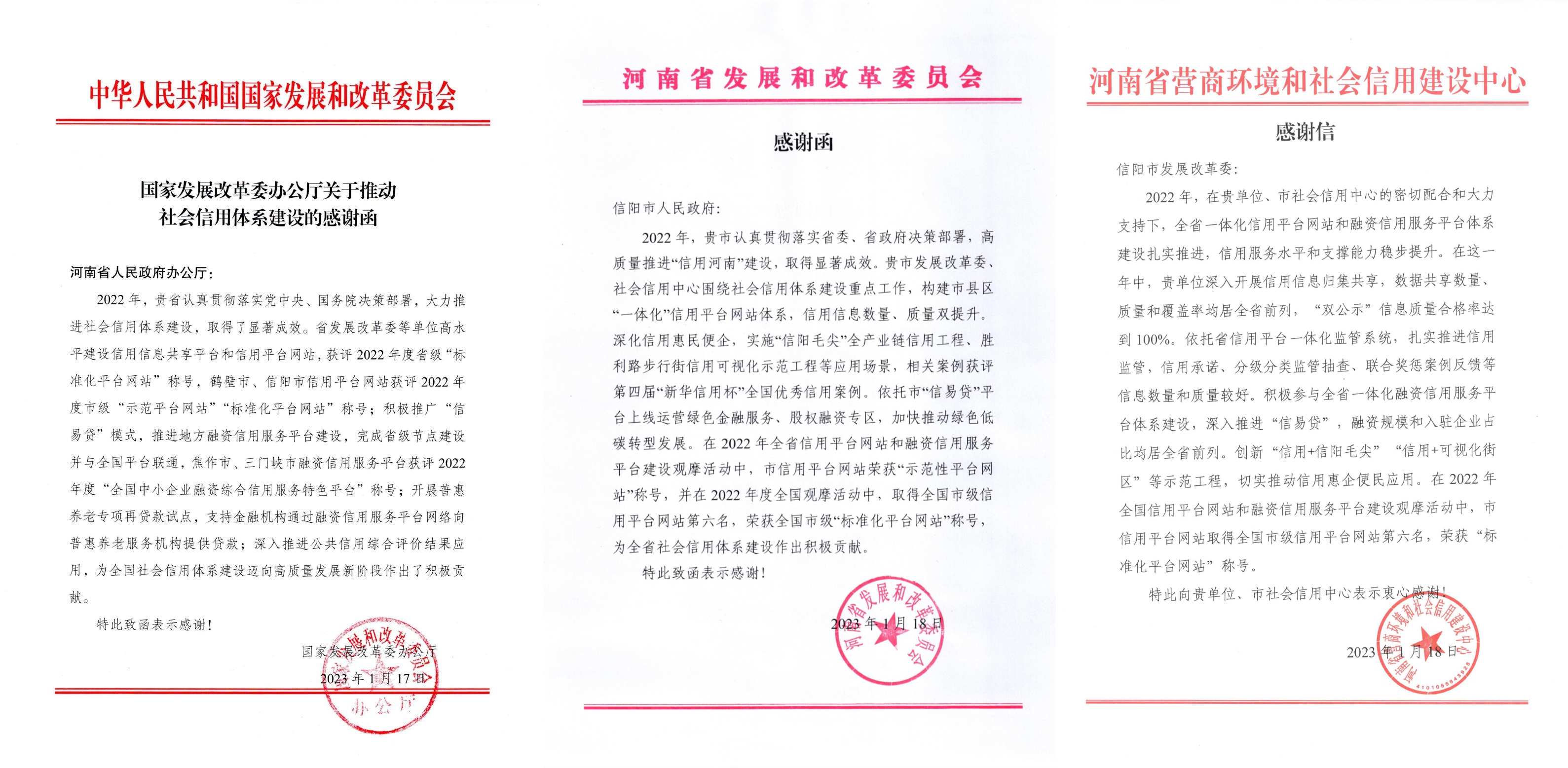 近日,国家发展改革委、河南省发展改革委、河南省营商环境和社会信用建设中心等部门向河南省、信阳市发来感谢函,对我市在2022年推进社会信用体系建设取得的显着成效提出表扬,为全省乃至全国社会信用体系建设迈向高质量发展新阶段作出的积极贡献表示感谢,我们深受鼓舞,备受激励。